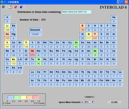 | [画面の説明] (1)特性名 「Disribution in Glass Data Containing」欄をダブルクリックして表示される小画面から、データ密度解析を実施したい特性項目を選択します。 (2)周期表 選択された特性値データを有するガラス組成を元素に分解し、対象となる全ガラスの元素別の利用頻度数を周期表形式に配列された元素名の下に表示します。 利用頻度: 各ガラスに含まれる元素の利用頻度をカウントします。例えば、あるガラスにAl2O3が含まれれば、Al を1回と数えます。O(酸素)はカウントしません。 「少量成分」の指定により、その成分の含有量が指定値未満となる元素はカウントしません。含有量の単位は検索結果リスト画面で使われた単位です。従ってat%を指定した場合以外は含有量は元素ごとではなく化合物ごとの量になります。 各元素は、カウント数に応じて色分け表示されます。色分けは最大のカウント数に対する割合の5段階です。 [機能の説明] (1)少量成分 「Ignore Minor Elements < 」欄の少量成分の割合を選択すると、足切りを0、1、5、10、15、20、25、30%の8段階で設定できます。 (2) [画面の印刷]アイコン表示画面をそのまま印刷します。 |